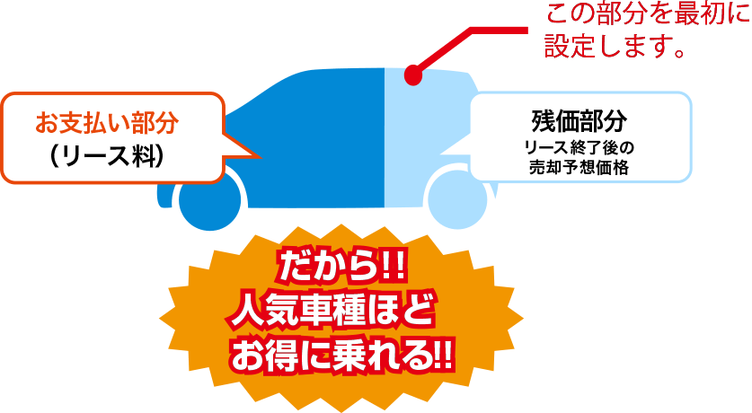 新車リースは、車輌本体価格から残価(売却予想価格)を差し引いているので、そのため月々のお支払いも軽減できるのです。!