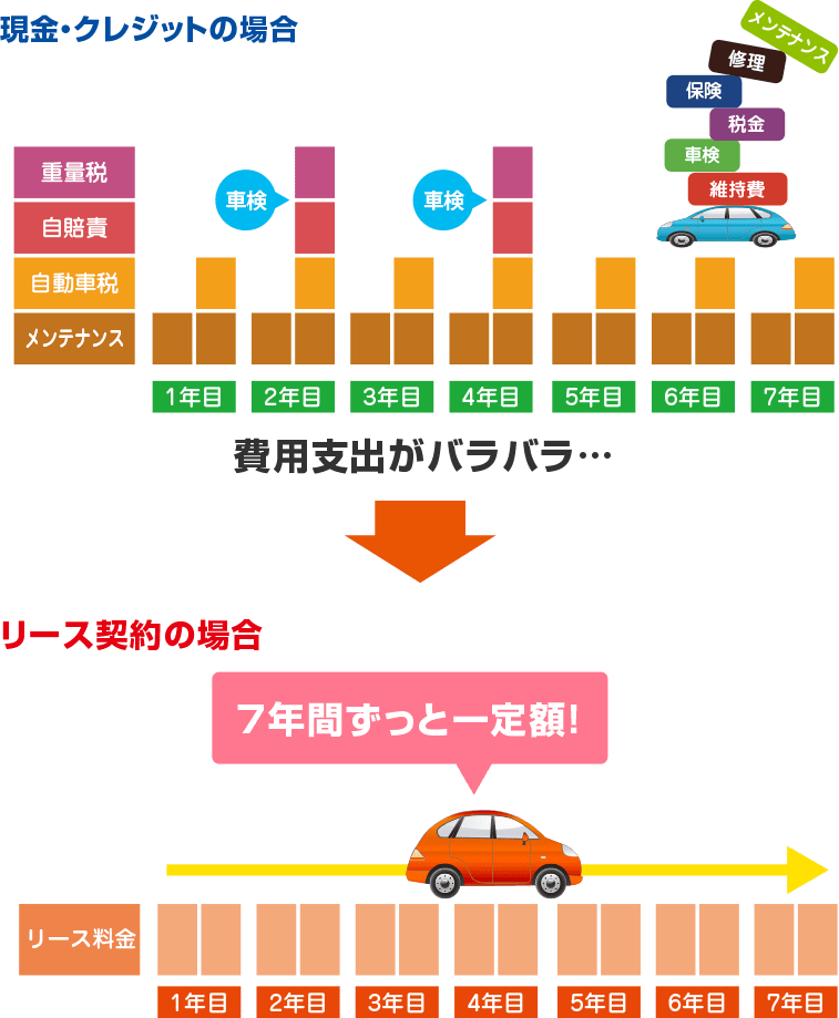 マイカーリースは月々1万円から乗れるリーズナブルな車の乗り方です。定額払いで突然の出費がないので資金計画が立てやすい事や、整備代・税金・諸費用も含んでいます。あなたは乗るだけで後はリース会社にお任せ。リース終了期間まで月々定額で安心。今、話題のリースシステムです
